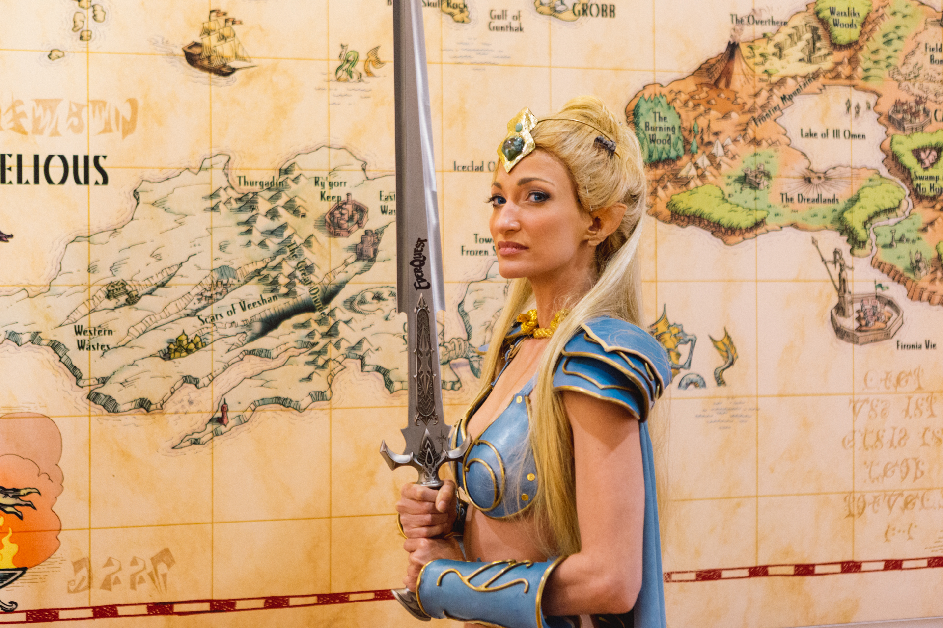 Firiona Vie battle-ready with the EverQuest 20th anniversary sword.