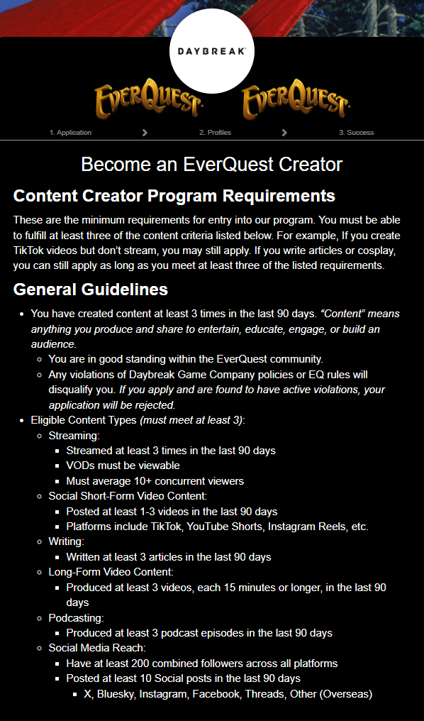 The EverQuest Content Creator Program is an official initiative by Daybreak Games to support and empower creators who bring the world of EQ to life. Whether you're tradeskilling, running Raids, exploring deep lore, or sharing your adventures through video, streams, podcasts, blogs, or guides this program is built to help you grow.