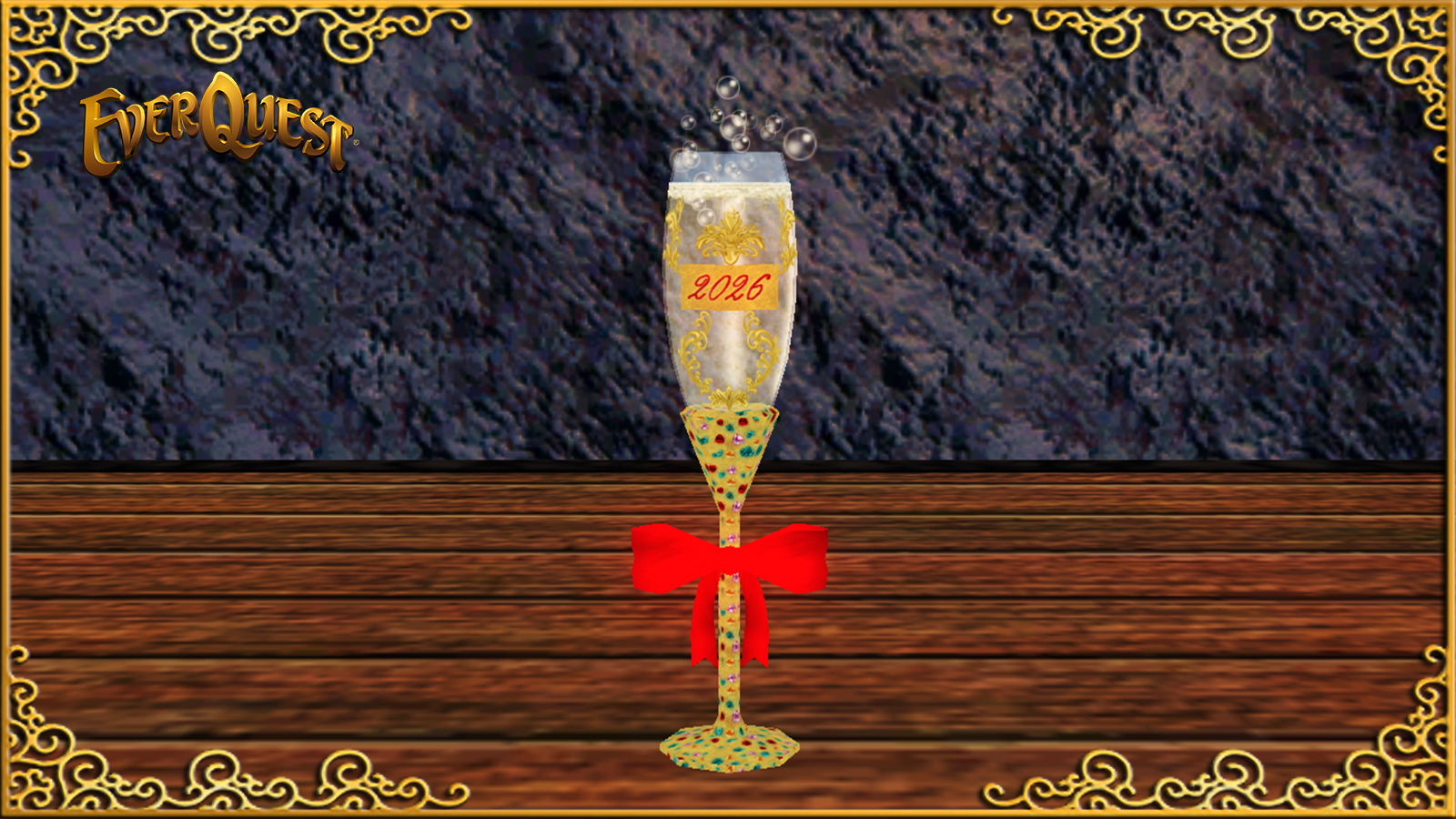 Get this beautiful champagne flute housing item and weapon ornament to commemorate another great EverQuest New Year!