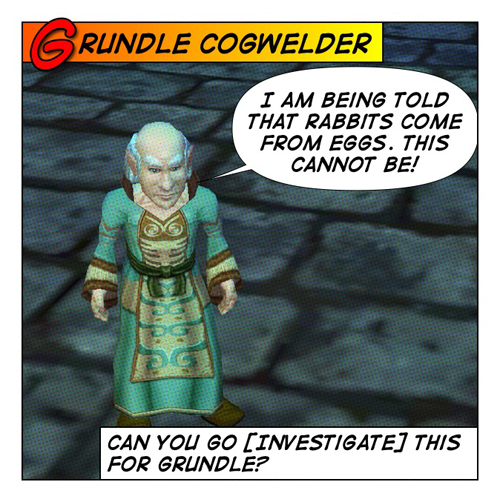Pay a visit to Grundle Cogwelder in the Plane of Knowledge to offer your assistance and help ease his mind, and you might just be rewarded.